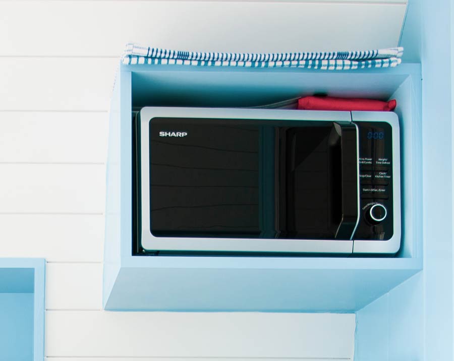 Top of the range SHARP microwave with grill built into a pocket above the kitchen.