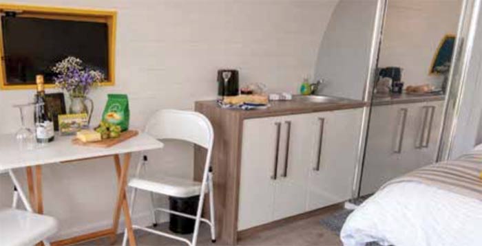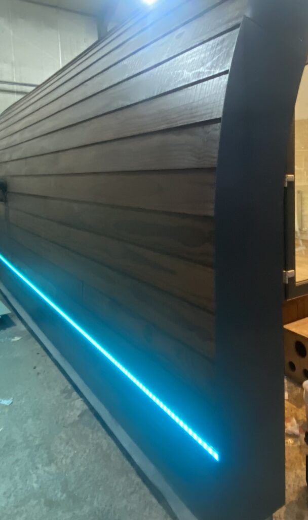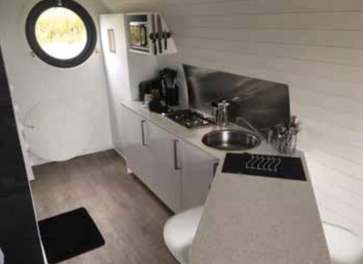 Stainless steel splashback for chosen kitchen area. Curved to the interior wall of the pod.